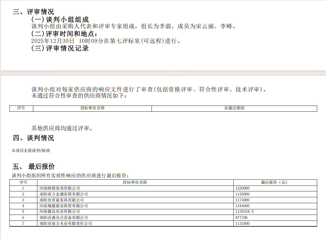 一、项目基本情况 1、采购项目编号:南阳政采谈判-2025-13 ******公安局安保反恐训练基地购置家具项目 3、采购方式:竞争性谈判 4、采购公告发布日期:2025年12月19日 5、评审日期:2025年12月30日 二、成交情况